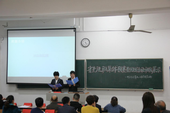 首先,参赛三个班级以PPT及视频的形式从班级简介、班级建设、班级成绩、班级活动等方面向我们展示了其班级。陈述结束后,同学们认真回答了嘉宾提出的问题。最后由丁江老师对本次评选活动进行了总结,在充分肯定了各班委的奉献精神,各班级的团结友爱,所办活动极具创新情况下;更要求各班班委继续努力创建优良的班级、宿舍学习氛围。