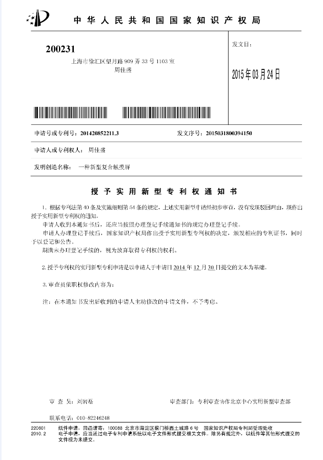 近日,我院计算机工程系2014级计算机科学与技术2班周佳盛同学申请的两项专利获得了国家知识产权局的正式授权,成为国家实用新型专利“一种多级组合台灯”(专利号201420847668.5)以及“一种复合型触摸屏”(专利号201420852211.3)两项专利的第一专利权人。